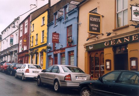 Typische Kulisse in Irlands Städten: bunte Häuser mit Einzelhandel, Bank, Pub oder ähnliches. Diese Häuserzeile findet man in Clifden (County Galway).