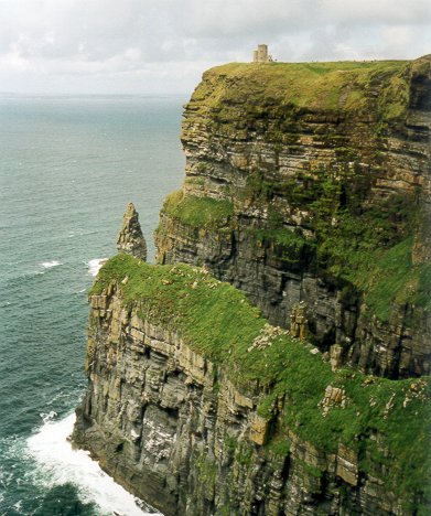 Cliffs of Moher mit halbhohem Felsen, der das reinste Vogelparadies ist. Leider kommt das auf dem Foto nicht so gut rüber.