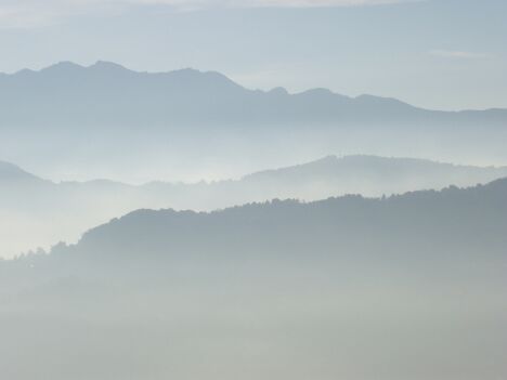 Das ist genau genommen kein Bild aus der Toskana, das ist das Tessin (Südschweiz): Blick auf den mit Morgennebel verhangenen See Lugano.
