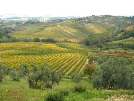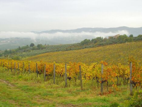 Tiefschwarze Weintrauben am Hang, Blick in ein nebelverhangenes Seitental.