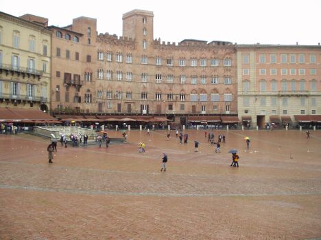 Il Campo in Siena. Auf dem muschelförmigen Platz aus roten Backsteinen findet noch heute der Palio statt, der Reiterwettkampf der Contraden (allerdings nicht, als wir da waren – da hat's bloß geregnet).