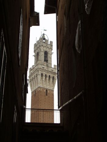 Der Turm des Rathauses in Siena, durch eine schmale Gasse betrachtet.