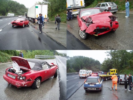 Tja und hier das weniger schöne Ende des Urlaubs. Sicherheitsgurten, Airbags und den Schutzengeln sei Dank, dass uns hier nicht viel passiert ist – auch wenn das Auto danach nur noch Schrottwert hatte. Am Unfall waren wir nicht schuld; jemand anderes ist bei etwa 110 km/h auf der Autobahn in uns hineingeschleudert. Zurück gekommen sind wir am nächsten Tag mit einem Mietwagen. Bei allen Formalitäten rund um den Unfall hat uns der ADAC sehr geholfen. Eineinhalb Jahre später habe ich dann auch den Schadensersatz erhalten (oder besser gesagt: die Hälfte). Die Mühlen der Versicherungen mahlen langsam in Italien...